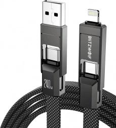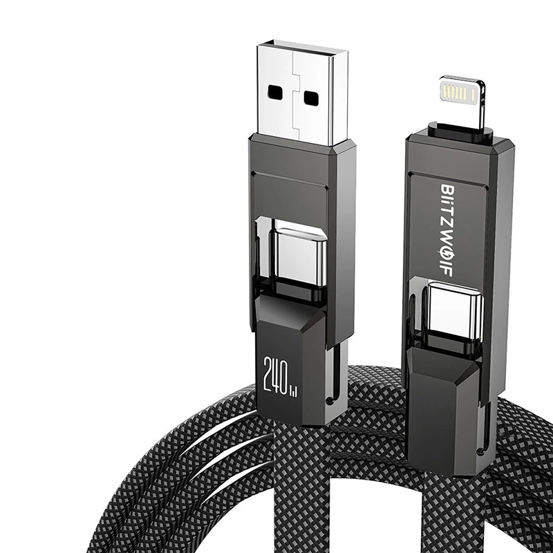 Univerzální kabel 4 v 1 od BlitzWolf kombinuje konektory USB‑A, USB‑C a Lightning pro rychlé nabíjení a přenos dat. Podporuje výkon až 240 W (USB‑C ↔ USB‑C), rychlé nabíjení PD pro iPhone až 27 W a přenos dat až 480 Mb/s. Odolné nylonové opletení a délka 1,2 m zajišťují dlouhou životnost a pohodlné používání doma, v kanceláři i na cestách.