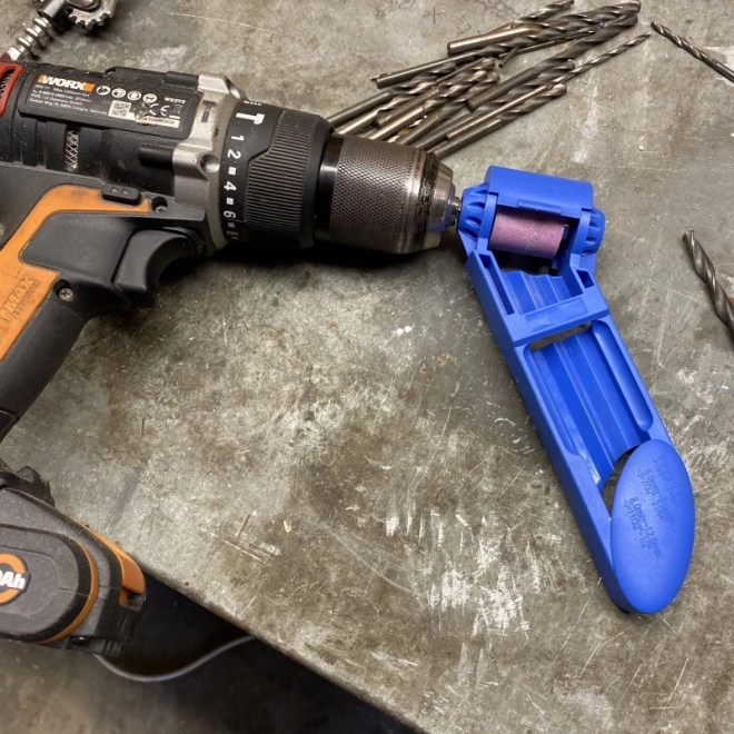 Stačí připojit k vrtačce a během chvilky obnovíte ostří vrtáků – ideální do dílny i na montáž.