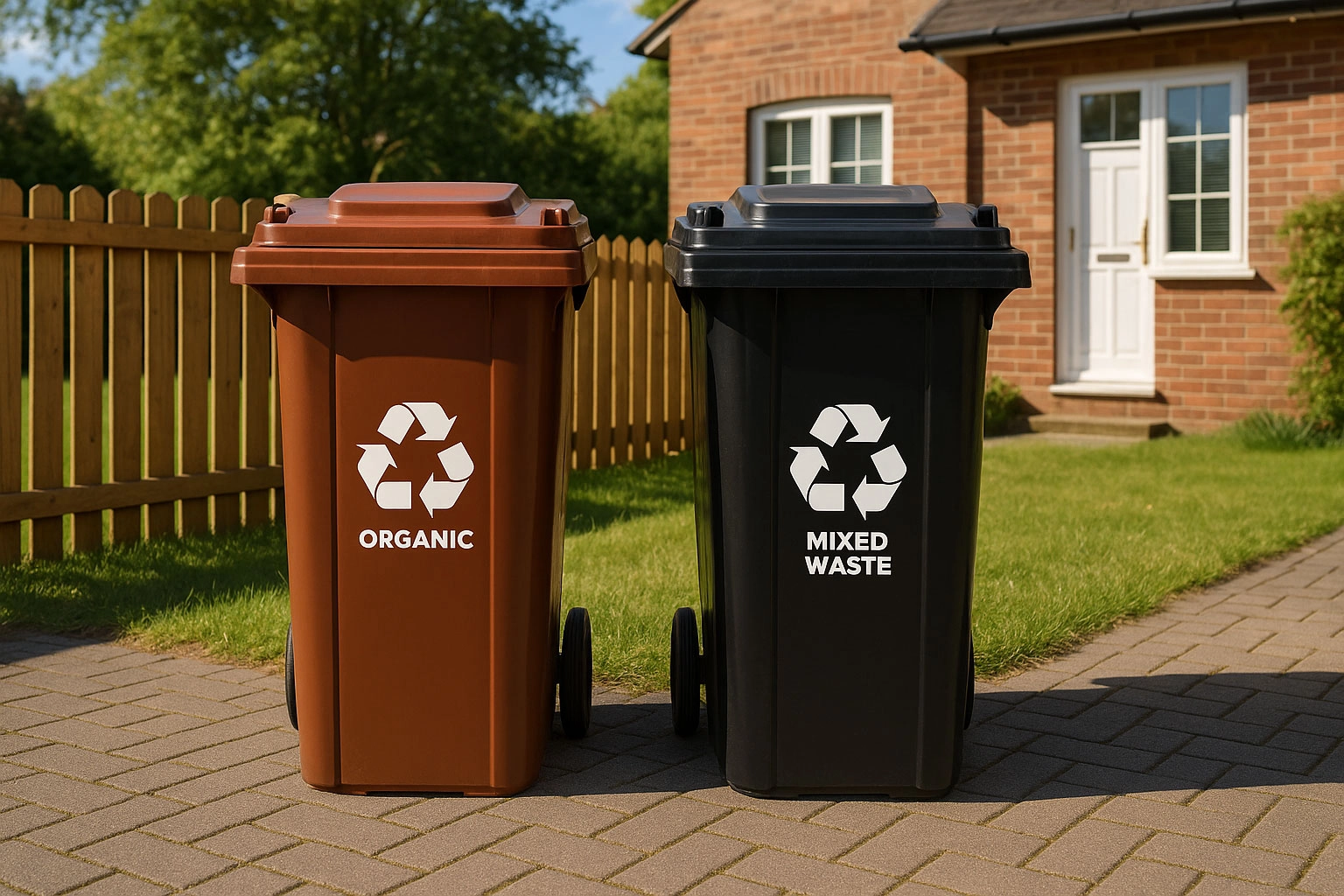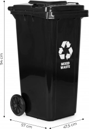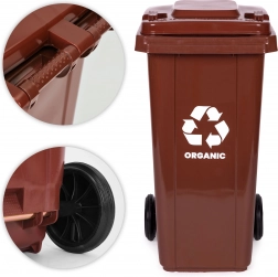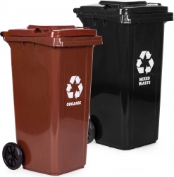 Praktická sada dvou odolných popelnic o objemu 2×120 l pro třídění směsného a bio odpadu. Vyrobeno z UV odolného HDPE, s gumovými koly na kovové ose, ergonomickými madly a uzamykatelným víkem. Stabilitu zajišťují protiskluzové nožky. Kompatibilní s komunálními svozovými systémy (EN-840) a certifikacemi ISO9001, ISO14001, ISO45001.