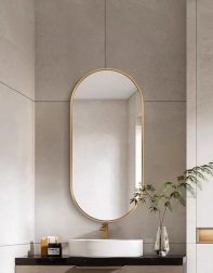 Elegantní oválné zrcadlo s rozměry 100 × 50 cm v matně zlatém hliníkovém rámu skvěle doplní interiér v loft, industriálním i moderním stylu. Nabízí křišťálově čistý odraz, voděodolnost a snadné čištění. Lze jej namontovat svisle i vodorovně a opticky prosvětlí a zvětší každý prostor.