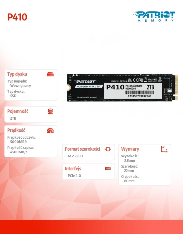Zrychlete svůj počítač s SSD PATRIOT P410 o kapacitě 2 TB. Nabízí rychlosti čtení až 5000 MB/s a zápisu až 4500 MB/s, úsporný provoz pro delší výdrž baterie a kompaktní formát M.2 2280 pro snadnou instalaci. Díky grafenovému tepelnému rozhraní a termální ochraně udržuje stabilní výkon i při zátěži – ideální pro hráče, tvůrce i profesionály.