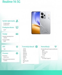 Stylový smartphone Realme 14 5G v barvě Mecha Silver přináší špičkový 6,67" AMOLED displej se 120 Hz a jasem až 2000 nitů, výkonný čip Snapdragon 6 Gen 4, velkou baterii 6000 mAh a fotografickou sestavu s 50Mpx hlavním fotoaparátem s OIS. Nechybí 5G, Wi‑Fi 6, Bluetooth 5.2, Dual SIM ani Android 15 s Realme UI 6.0.