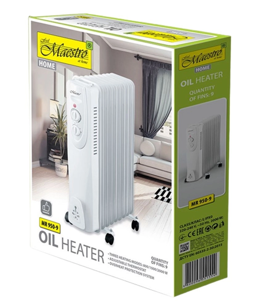 Kompaktní a výkonný olejový radiátor Maestro MR-950-9 poskytne rychlé a rovnoměrné teplo v domácnosti i kanceláři. Díky 3 stupňům výkonu (800/1200/2000 W), 9 topným žebrům a nastavitelnému termostatu snadno dosáhnete ideální teploty. Kontrolky provozu a kolečka pro snadný přesun zajišťují pohodlné a bezpečné používání.