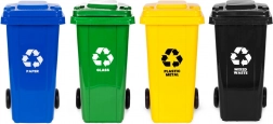 - Modrá – papír; Zelená – sklo; Žlutá – plast/kov; Černá – směsný odpad