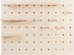 Dřevěná pegboard tabule MACLEAN kombinuje elegantní vzhled světlého dřeva s praktickou funkčností. Systém otvorů umožňuje libovolně přesouvat 3 odnímatelné police a 5 háčků/kolíků, takže si snadno vytvoříte vlastní rozložení pro každodenní věci. Ideální do předsíně, pracovny, kuchyně i ateliéru.