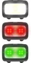 - 7 režimů: bílá LED (silná/jasná/ztlumená/blikání), červené světlo (stálé/blikání) a zelené světlo
