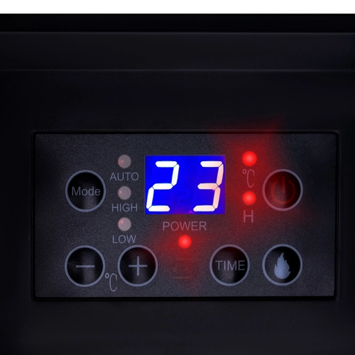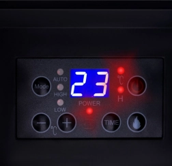 Ohřívač nabízí 3 režimy (vysoký/nízký/auto), regulaci teploty 26–38 °C, LCD displej a časovač v krocích po 1 h (1–8 h). Praktické dálkové ovládání a přehledný panel usnadní obsluhu z gauče. O vaši bezpečnost se stará tepelná pojistka, ochrana proti přehřátí, vyklápěcí spínač a ochranná mřížka. Stabilní nožky a integrované madlo zajišťují snadné přenášení.