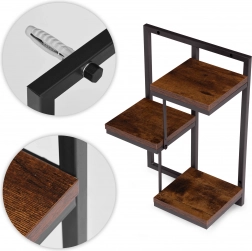 Odolná ocelová konstrukce s práškovým lakem odolává korozi i mechanickému opotřebení, zatímco police z laminované dřevotřísky v dekoru dřeva podtrhují elegantní vzhled. Promyšlený systém upevnění s předvrtanými otvory a přiloženými hmoždinkami a šrouby zajišťuje stabilitu i při vyšším zatížení.