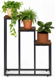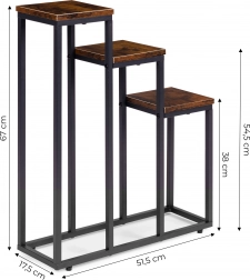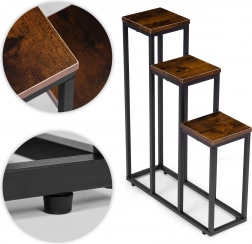 Moderní stojan na květiny se třemi úrovněmi šetří místo a umožní vám vytvořit působivou expozici rostlin v obýváku, pracovně i komerčních prostorách. Má stabilní ocelovou konstrukci s práškovým lakem, 3 odolné police z DTD v dekoru dřeva a protiskluzové nožky pro ochranu podlahy. Maximální nosnost jedné police je 5 kg.