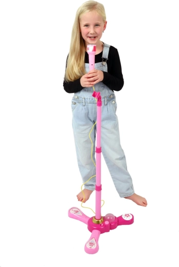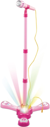 Růžový karaoke mikrofon na stojanu promění každý dětský pokoj v pódium. Nabízí 12 vestavěných písní, barevné světelné efekty a možnost připojení MP3 nebo mobilu. Díky nastavitelné výšce 40–80 cm roste s dítětem a je ideální pro malé zpěváky od 3 let.