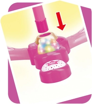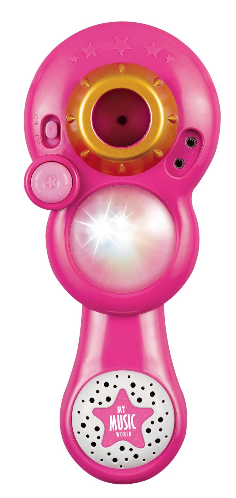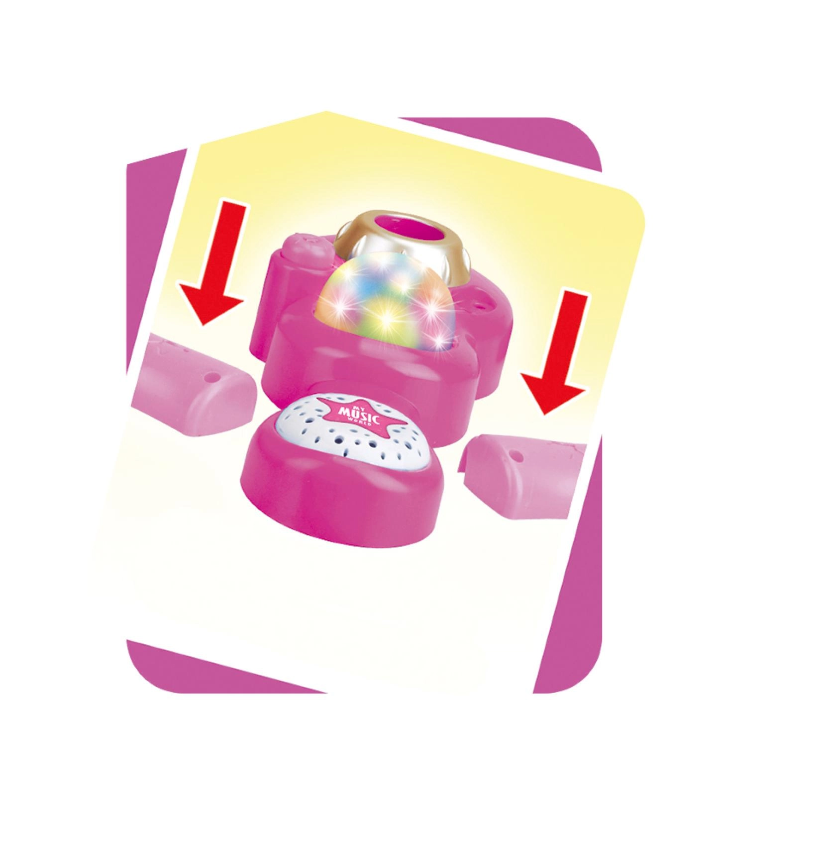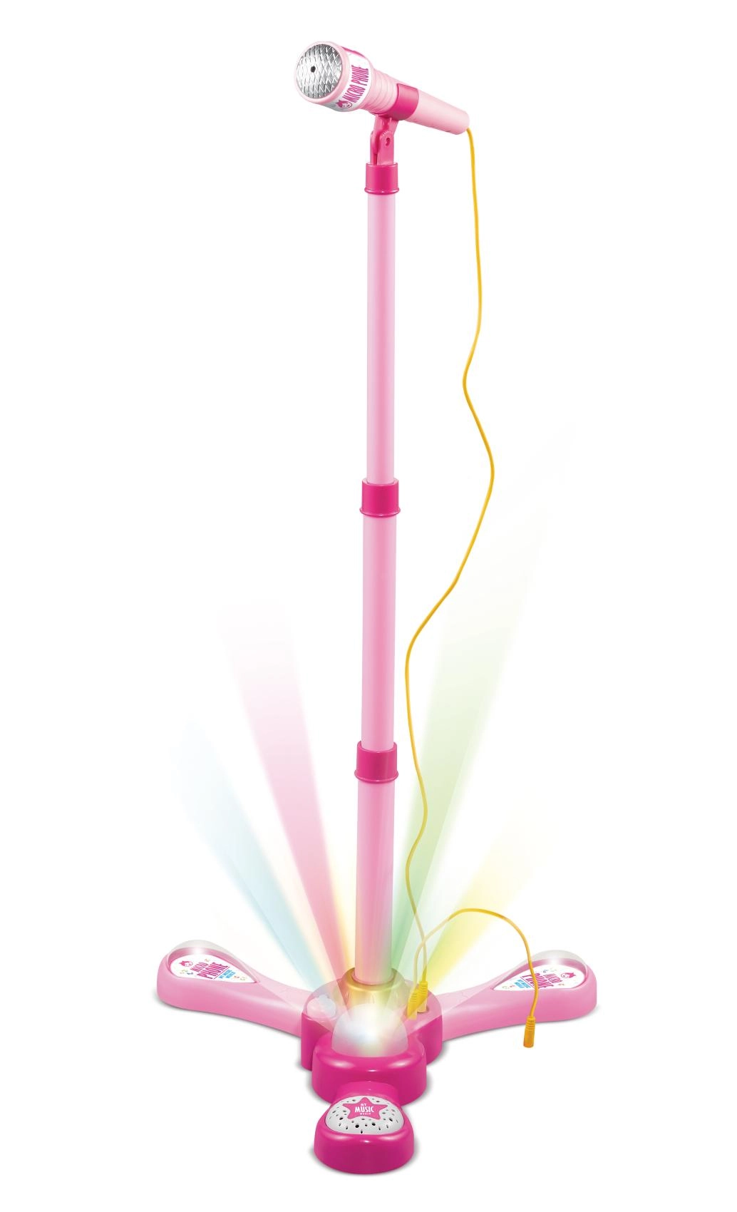 Uspořádejte doma nezapomenutelnou karaoke show. Tento růžový mikrofon se stabilním tripodovým stojanem má poutavé světelné efekty a přehraje 12 předem nahraných písní. Snadno k němu připojíte MP3 přehrávač nebo mobilní telefon a pustíte oblíbené hity.