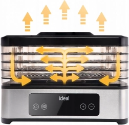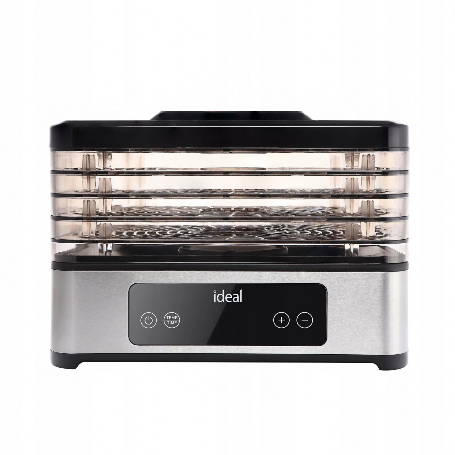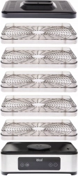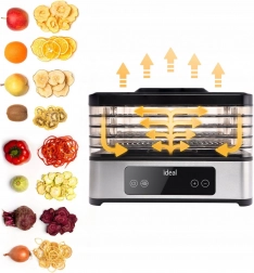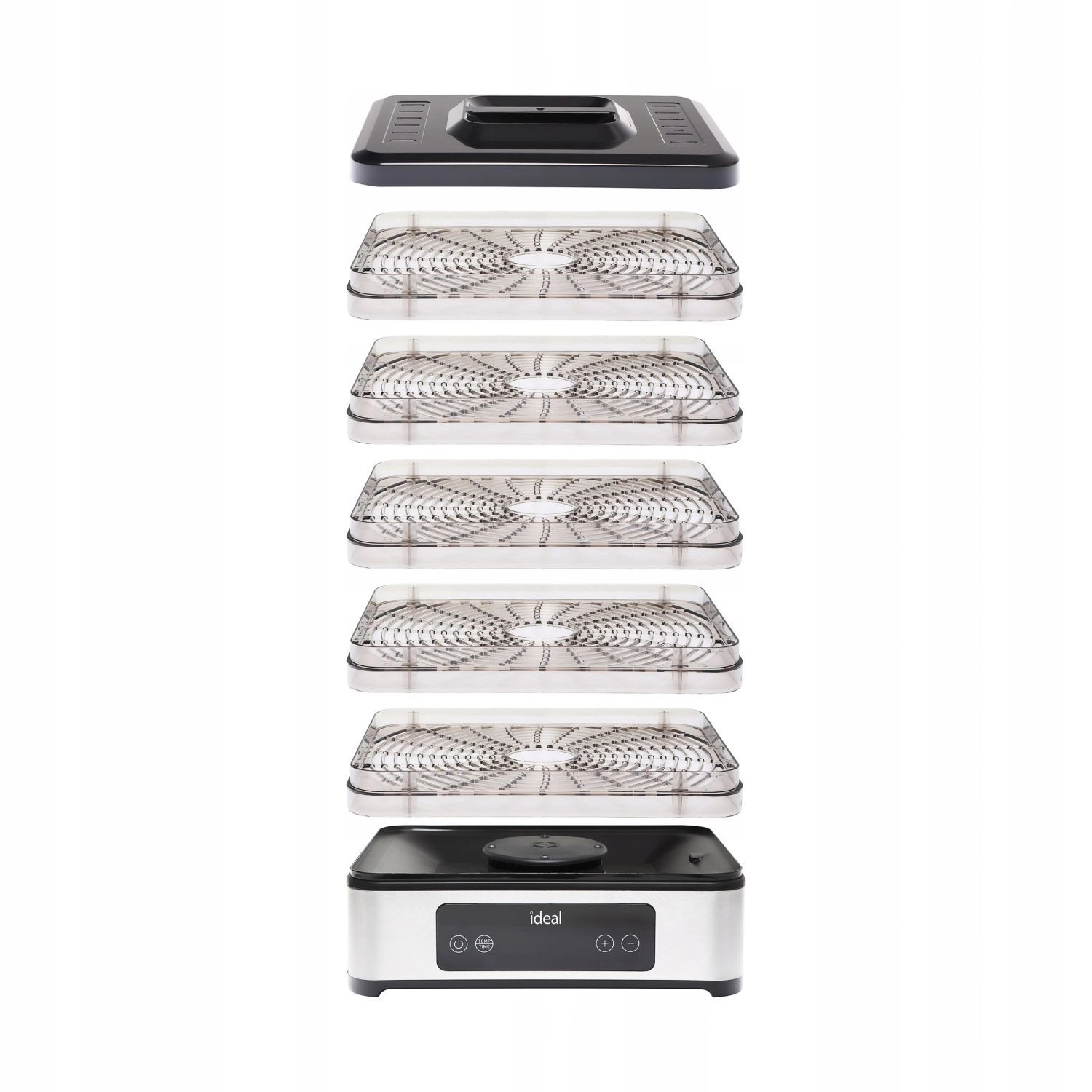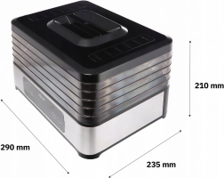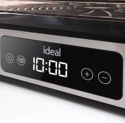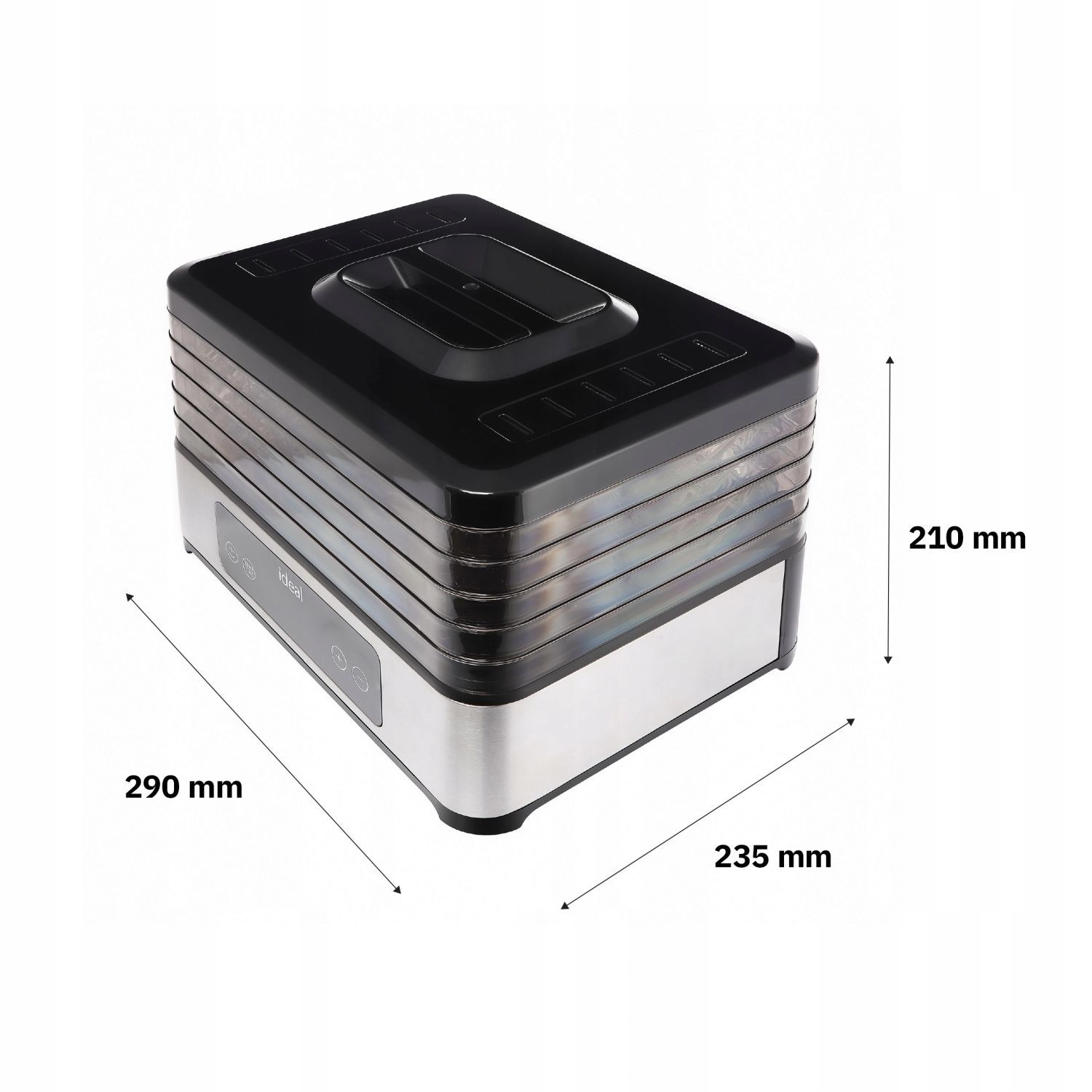 Ovládání je maximálně jednoduché díky elektronickému LED panelu s časovačem 30 minut až 24 hodin. Tichý a energeticky úsporný provoz se hodí pro noční sušení, průhledné provedení umožní průběžně sledovat průběh bez otevírání. Tácí mají nastavitelnou výšku pro různé velikosti plátků a zařízení se snadno rozebírá a čistí.