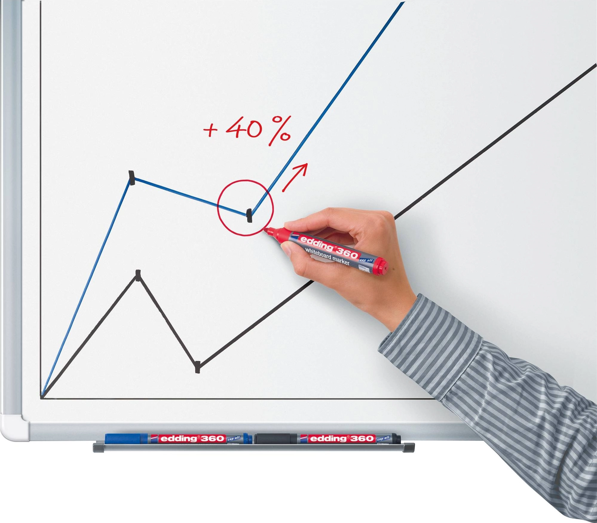 Oblíbený popisovač Edding 360 je ideální pro každodenní psaní na všechny typy bílých tabulí. Díky pigmentovému inkoustu se slabým zápachem a bez obsahu butylacetátu se pohodlně používá v kanceláři, škole i doma. Zapisovaný text je sytě červený, dobře čitelný a lze jej snadno smazat za sucha bez zanechání stop.
