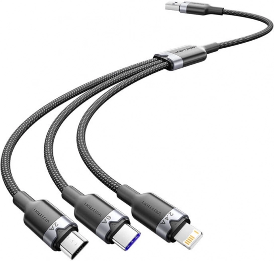 Vention 3 v 1 je praktický kabel, který vám nahradí několik nabíječek a kabelů. Podporuje rychlé nabíjení až 120 W (USB‑C) a současně zvládne napájet více zařízení. Integrovaný čip chytře rozděluje energii, aby každé zařízení dostalo optimální proud bez přehřívání či přebíjení.