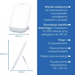 Zlepšete náladu a energii se světelnou lampou BEURER TL 85. Nabízí 10 000 luxů při vzdálenosti cca 20 cm, rovnoměrné LED osvětlení, velkou plochu světla a dotykové ovládání. Ideální v obdobích nedostatku denního světla pro podporu celkové pohody.