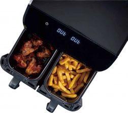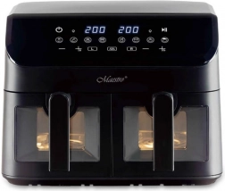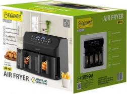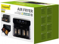 MAESTRO MR-758 kombinuje rychlou cirkulaci horkého vzduchu s prostornými dvojitými koši 2×4,5 l, takže současně připravíte například hranolky a kuře – každý v nezávislé zóně s vlastním nastavením času a teploty. Díky povrchu s nepřilnavou úpravou je čištění snadné a každodenní používání komfortní.