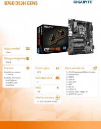Vytvořte si moderní sestavu s deskou GIGABYTE B760 DS3H GEN5. Nabízí rozhraní PCIe 5.0 x16 pro maximální propustnost grafických karet, dvojkanálovou DDR5 paměť pro vyšší výkon a nízkou latenci a dvojici slotů M.2 PCIe 4.0 x4 pro bleskově rychlé NVMe SSD.