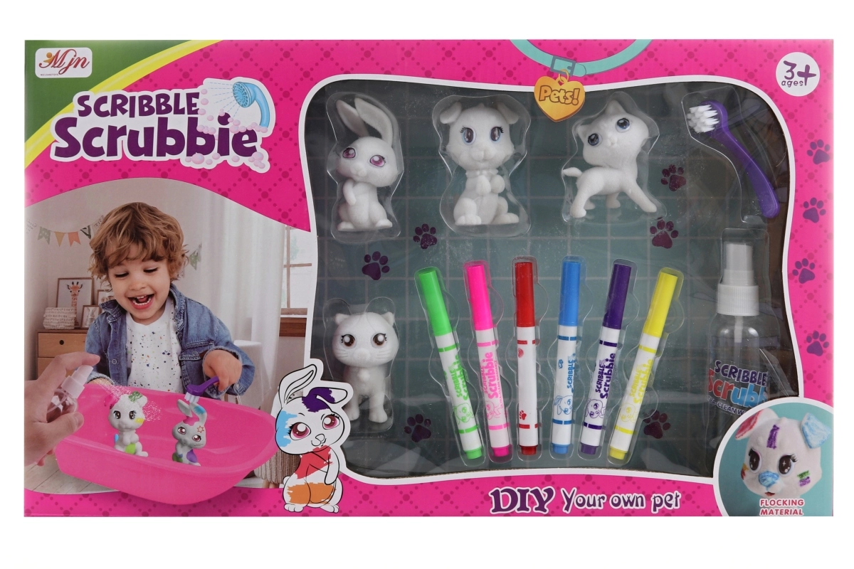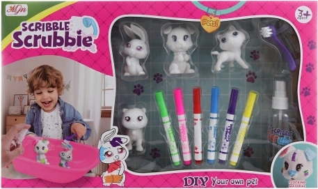- Kompletní výbava – 4 zvířátka, 6 barev, vanička, kartáček a rozprašovač