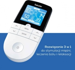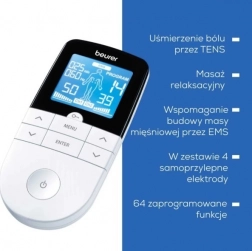 Multifunkční elektrostimulátor BEURER EM 49 spojuje TENS pro úlevu od bolesti bez léků, EMS pro trénink a regeneraci svalů a relaxační masáž. Nabízí 64 přednastavených programů a 6 uživatelských režimů s možností nastavení frekvence, šířky impulzu a doby zapnutí/vypnutí. Díky 2 nezávislým kanálům, indikaci polohy elektrod a funkci Oblíbený program je ovládání rychlé a intuitivní. Lékařský prostředek.