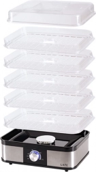 Pro bezpečnost je sušička vybavena ochranou proti přehřátí. Stabilní základna z nerezové oceli, přehledný otočný ovladač a snadná údržba z ní dělají spolehlivého pomocníka do každé domácnosti.