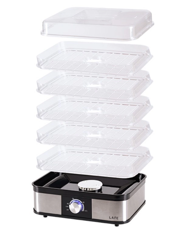 Transparentní patra usnadňují kontrolu procesu, zatímco 5 objemných táců dovolí sušit větší množství surovin najednou. Pokud potřebujete ušetřit místo, některé tácy jednoduše odejmete. Integrovaný ventilátor a perforované tácy podporují cirkulaci, brání vzniku plísní a zkracují dobu sušení.