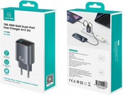 USAMS T66 s výkonem 45 W využívá moderní GaN technologii pro vysokou účinnost v malém těle. Jeden port USB‑C a jeden USB‑A umožní rychle dobíjet širokou škálu zařízení – od smartphonů a tabletů po kompatibilní notebooky s USB‑C napájením.
