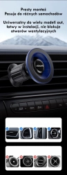 Montáž typu hook s šroubovou regulací pevně ukotví držák v mřížce a brání jeho uvolnění či vypadnutí. Instalace je rychlá, bez nástrojů a kompatibilní s většinou automobilů. Díky univerzální magnetické ploše spolehlivě podrží telefony různých velikostí, včetně těch v ochranném pouzdře.