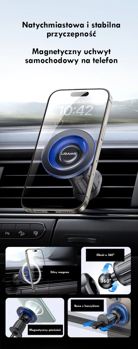 USAMS ZJ081 kombinuje odolné materiály (akryl a silikon) s promyšlenou ergonomií. Silné magnety se systémem automatického centrování zajistí stabilní fixaci telefonu, zatímco kulový kloub umožní hladké nastavení v režimu na výšku i na šířku. Kompaktní rozměry nepřekážejí v kabině a nezatěžují mřížku ventilace.