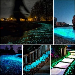 Fluorescenční kamínky se přes den nabijí světlem a v noci září sytě modře, což zvýrazní cesty, záhony i vodní plochy.
