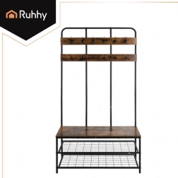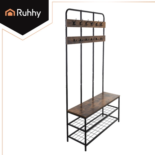 Udělejte z vaší předsíně přehledné a stylové místo. Tento multifunkční regál RUHHY nabízí chytré ukládání obuvi, svršků i doplňků. Robustní ocelový rám s práškovým lakováním a MDF deska v teplém dřevodekoru zajistí dlouhou životnost, stabilitu a pohodlí při obouvání.