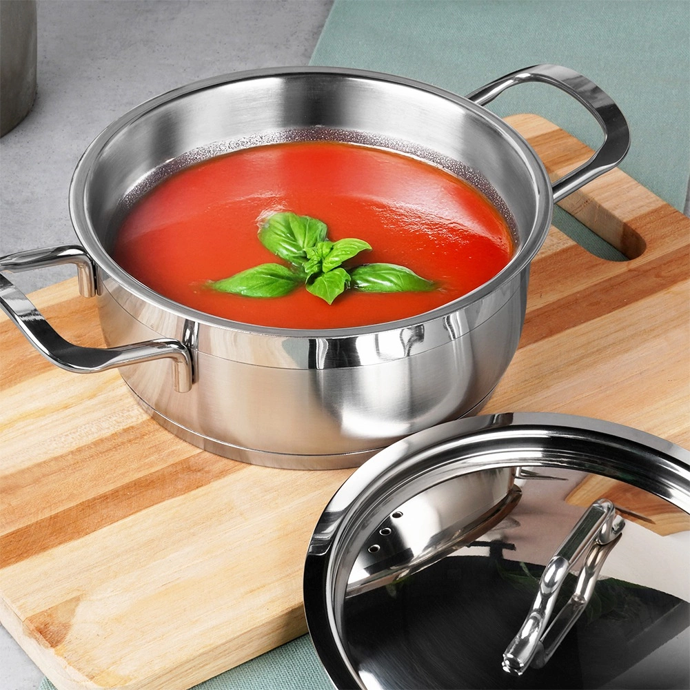 Objevte odolný hrnec Anett z kvalitní nerezové oceli 18/10 s matným povrchem a elegantním lesklým pásem. Vícevrstvé akutermické dno rychle akumuluje a rovnoměrně šíří teplo, což zkracuje čas přípravy a šetří energii. Je ideální pro vaření polévek, omáček i dušení zeleniny či masa.
