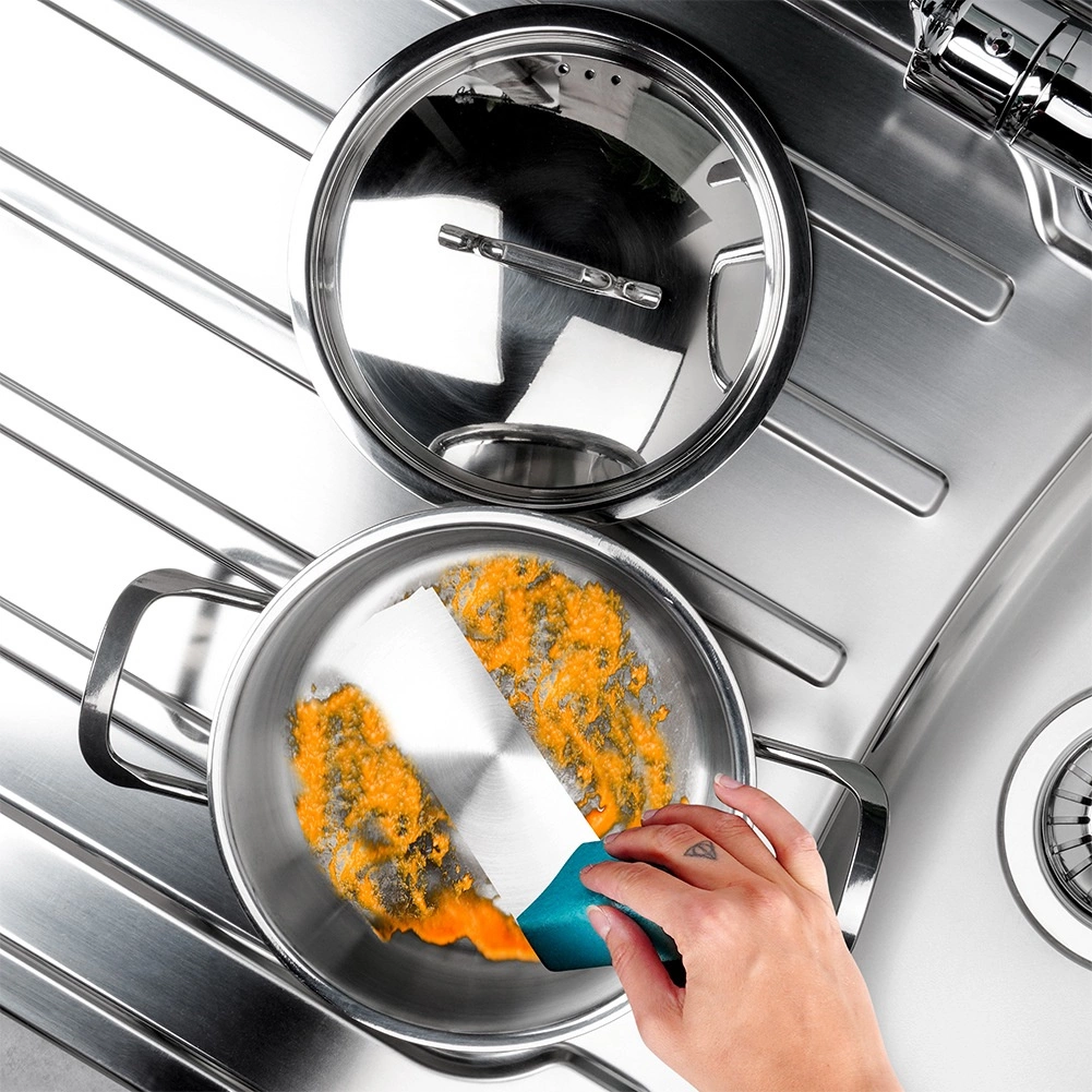 Robustní sendvičové dno výborně akumuluje a rovnoměrně rozvádí teplo, což zkracuje dobu vaření a šetří energii na všech typech sporáků včetně indukce.