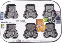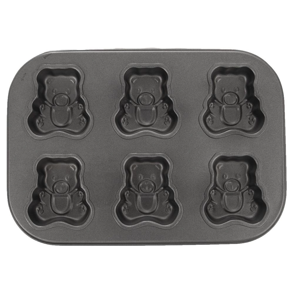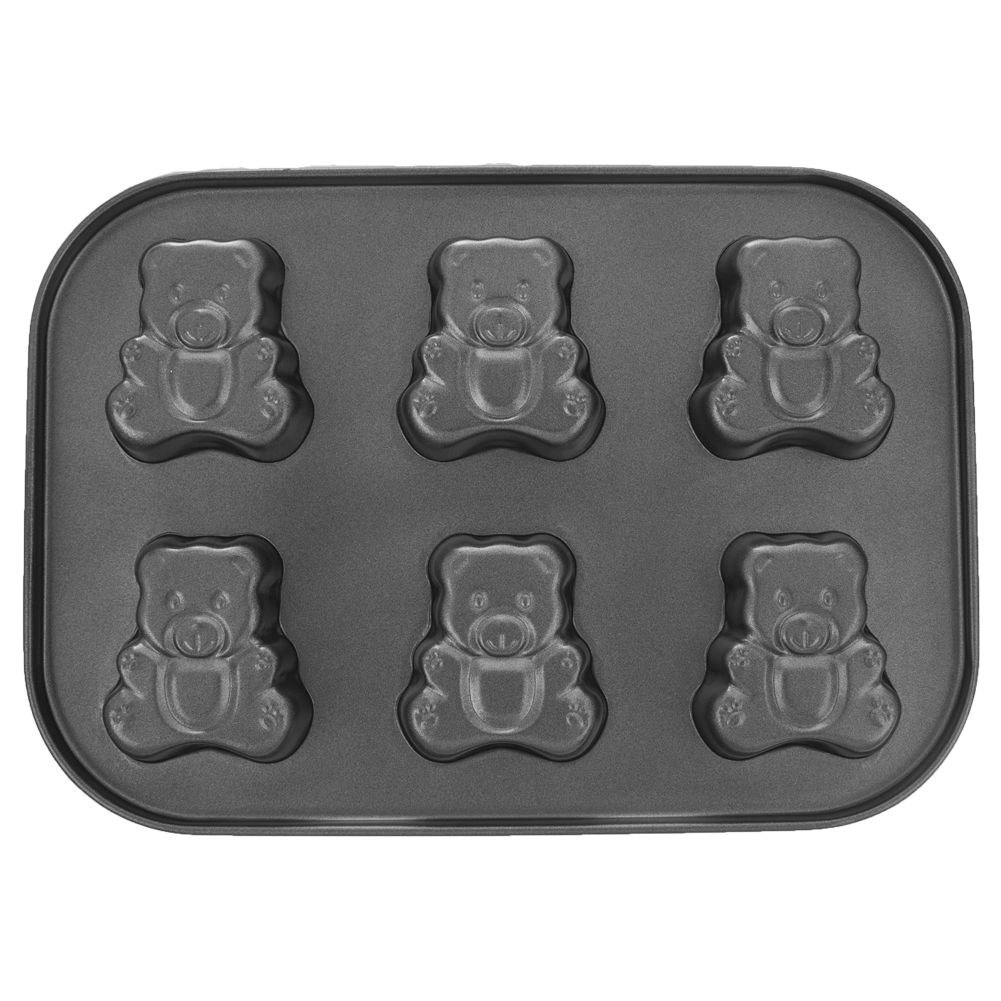 Tato kvalitní forma o rozměrech 26,5 × 18,5 × 2,5 cm vytváří 6 detailně tvarovaných medvídků o velikosti cca 6 × 5,5 cm. Díky nepřilnavému povrchu se těsto nelepí a hotové kousky jednoduše vyklopíte bez poškození tvaru. Perfektní pro oblíbené pečené medvídky se sladkou náplní i jednoduché piškotové těsto.