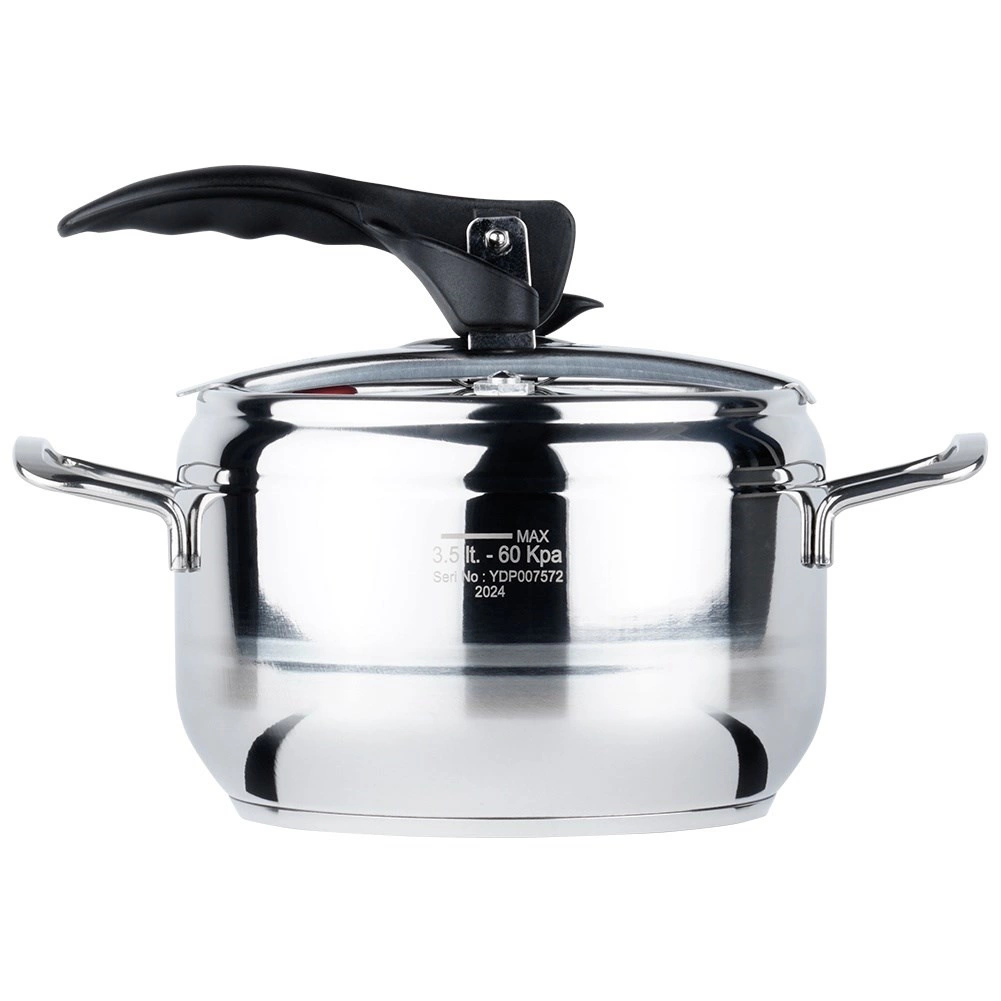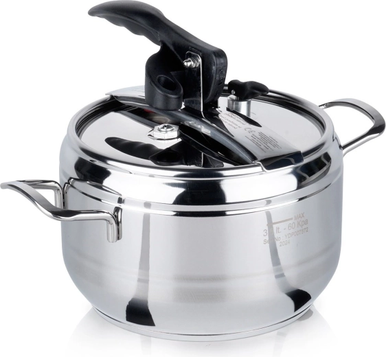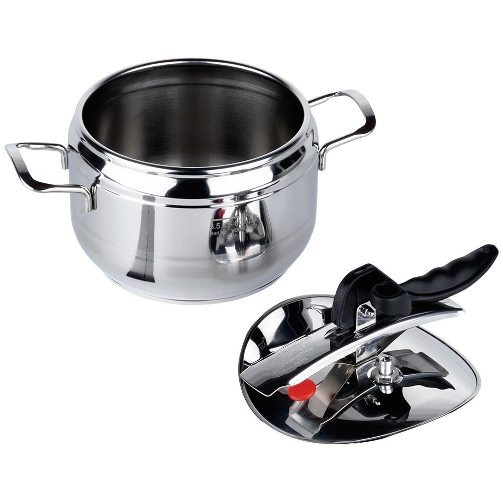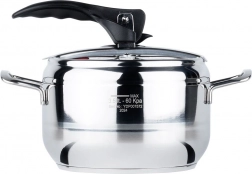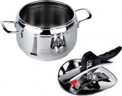 Kompaktní nerezový tlakový hrnec o objemu 3,5 l pro rychlé, úsporné a zdravé vaření pod tlakem. Díky 3vrstvému dnu, regulaci tlaku a dvěma bezpečnostním ventilům zkracuje čas přípravy a šetří energii. Vhodný na plyn, elektřinu, keramiku, halogen i indukci a lze mýt v myčce (bez poklice).