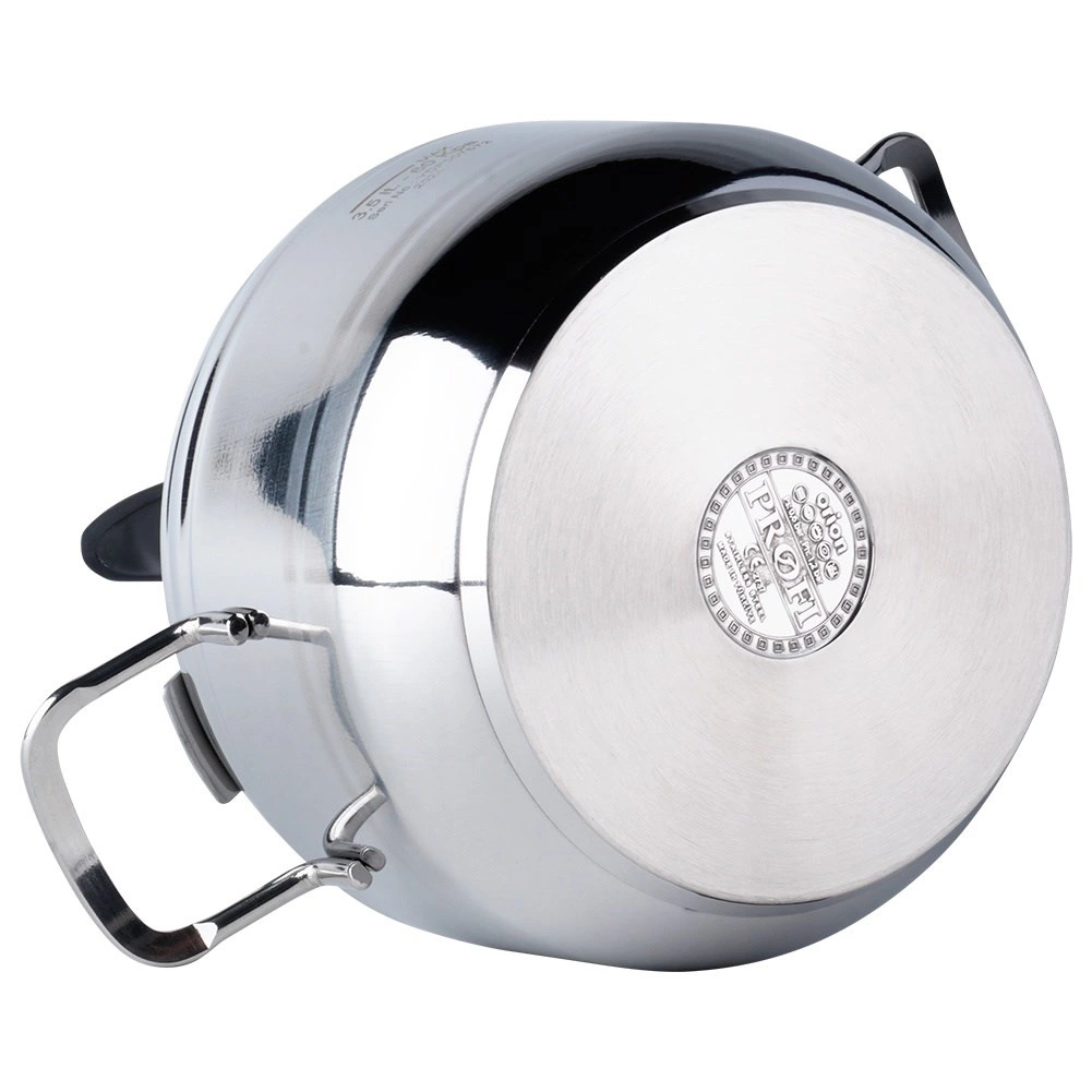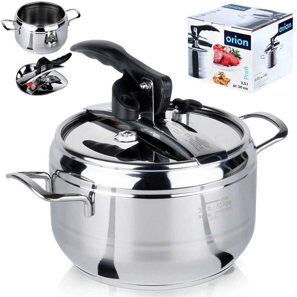 Tlakový hrnec Profi 3,5 l je spolehlivý pomocník pro každodenní vaření. Vysoká kvalita nerezové oceli, pevné uzavírání a bezpečnostní prvky zajišťují bezpečný provoz, zatímco vaření pod tlakem výrazně zkracuje dobu přípravy i spotřebu energie. Celkový objem činí 3,5 l; doporučený pracovní objem je přibližně 2/3.