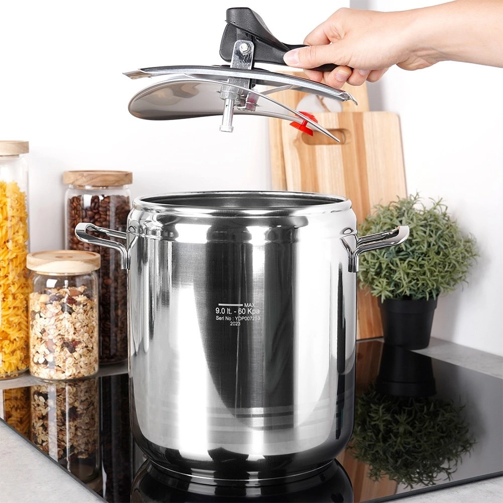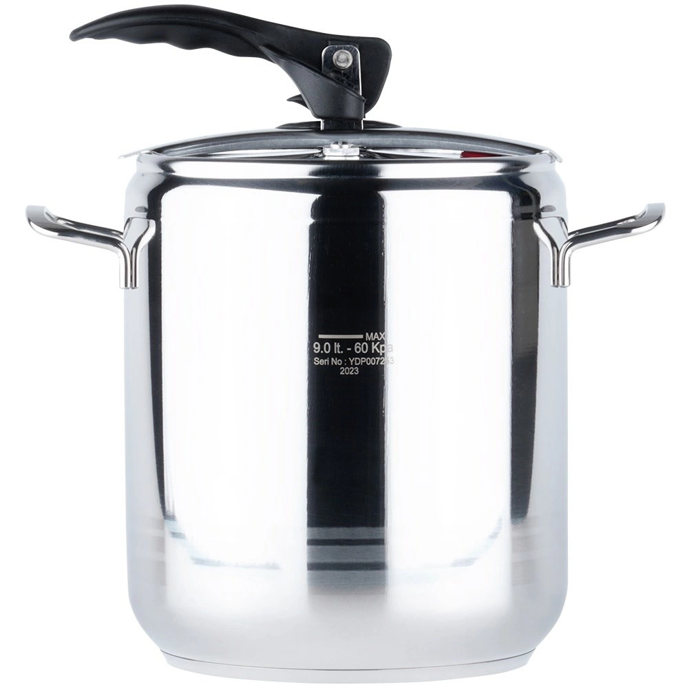 Tlakový hrnec Profi 9 l je spolehlivý pomocník pro každodenní vaření. Vaří pod vysokým tlakem, díky čemuž výrazně zkracuje čas přípravy a šetří energii i živiny v pokrmech. Celkový objem nádoby je 9 l, doporučený pracovní objem pro tlakové vaření je přibližně 2/3, což zaručuje bezpečný a efektivní provoz.