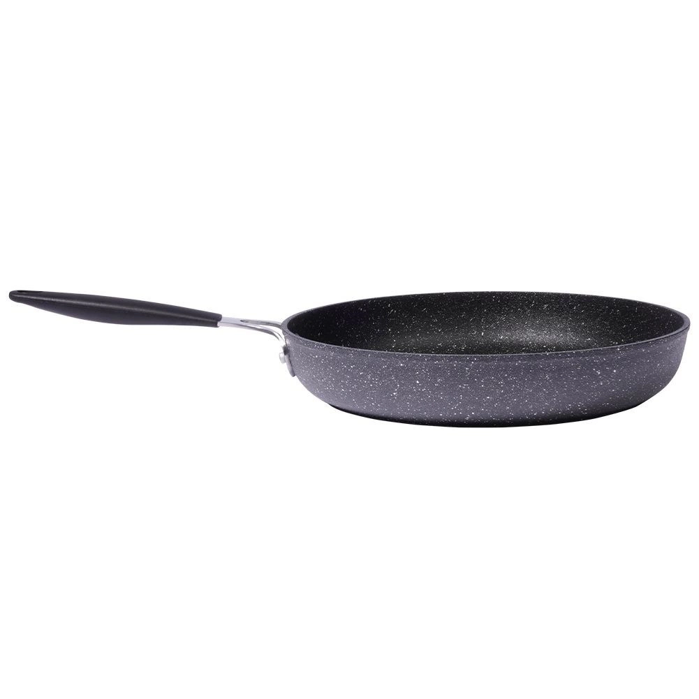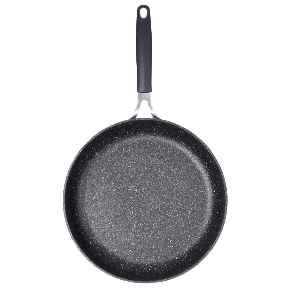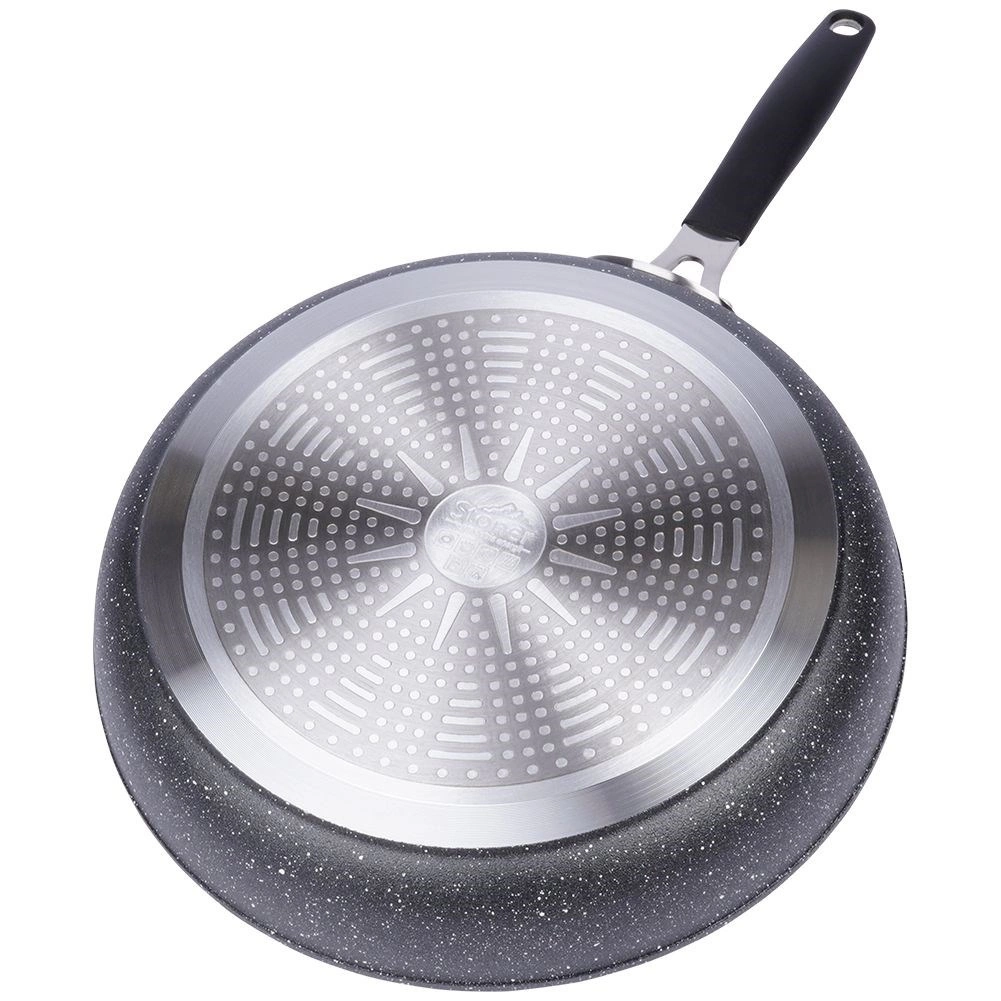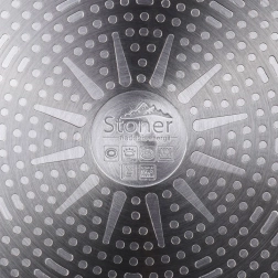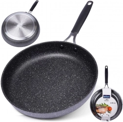 Robustní granitová pánev STONER o průměru 28 cm z hliníkového odlitku s kamenným povrchem pro každodenní vaření. Nabízí nepřilnavý povrch pro zdravé smažení s minimem tuku, rychlý a rovnoměrný rozvod tepla, kompatibilitu se všemi typy sporáků včetně indukce a ergonomickou rukojeť s otvorem na zavěšení. Vhodná i do trouby (rukojeť do 200 °C), snadno se čistí a je bez PFOA a PTFE.