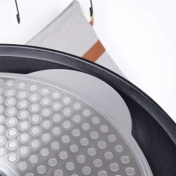 Odolné hliníkové tělo s vícevrstvým dnem je energeticky úsporné – ztráty tepla jsou minimální a pokrmy jsou hotové rychleji. Pánev lze použít na plynové, elektrické, sklokeramické i indukční varné desky. Ergonomická rukojeť z odolného plastu se nezahřívá a poskytuje bezpečný úchop i při delším vaření.