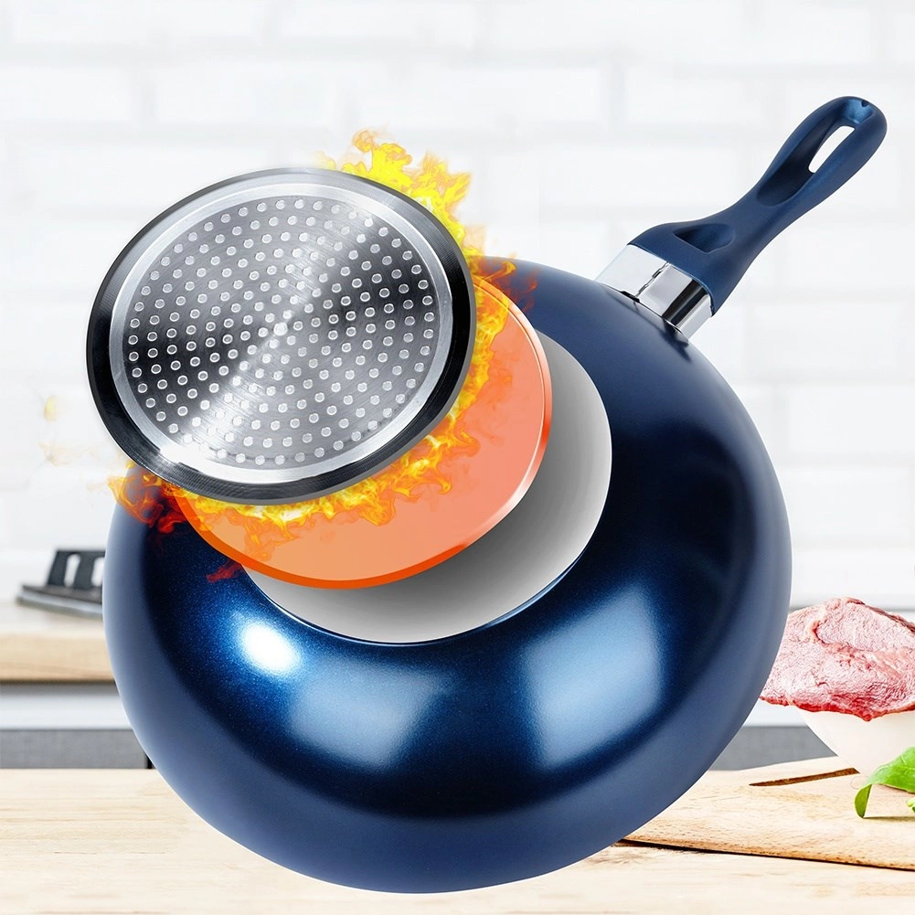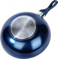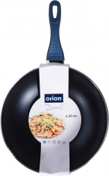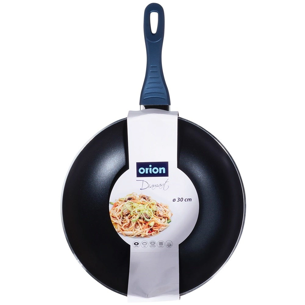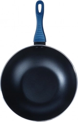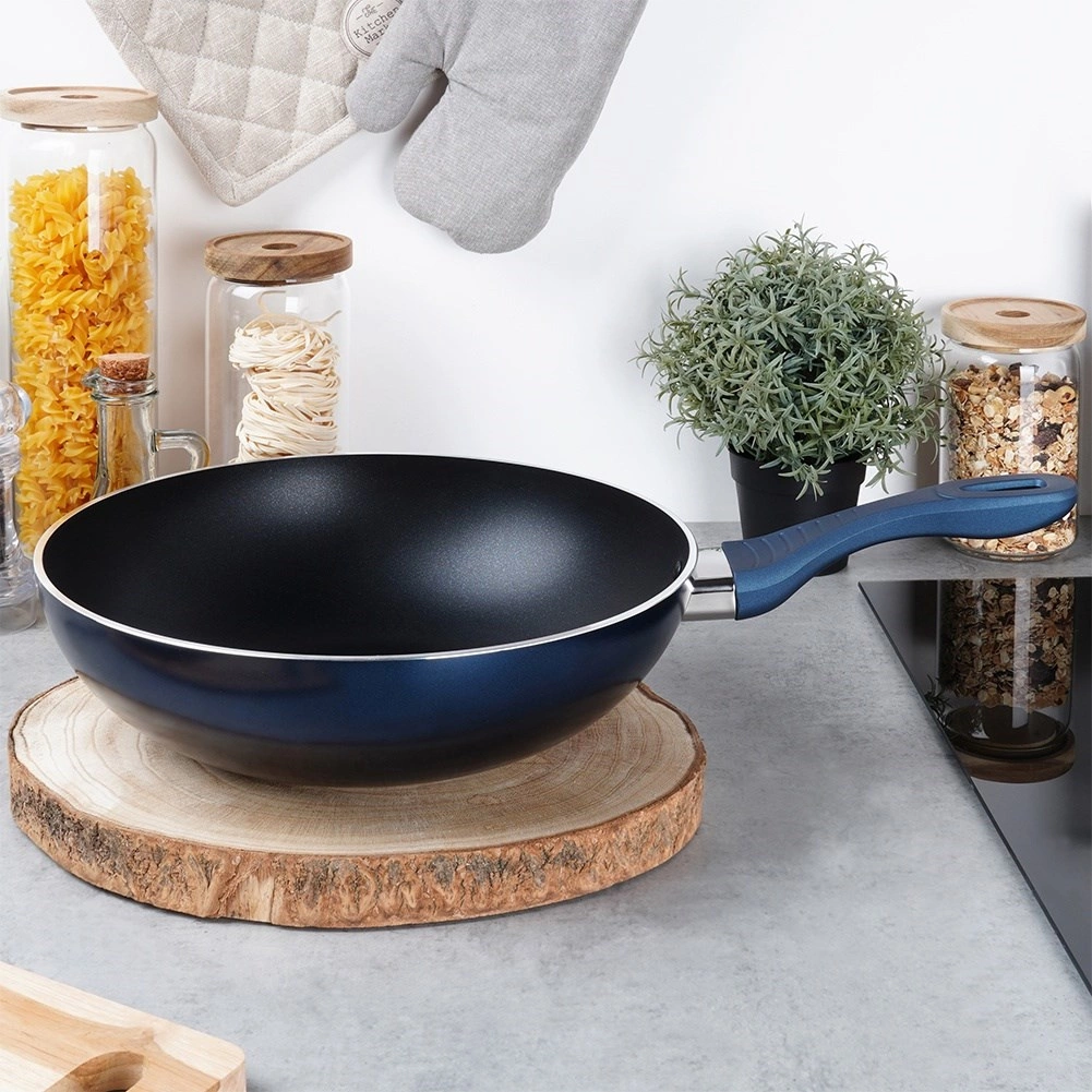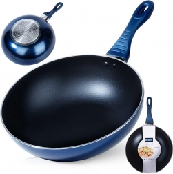 Univerzální wok pánev o průměru 30 cm s vysoce odolnou diamantovou nepřilnavou povrchovou úpravou pro rychlé a rovnoměrné vaření. Robustní hliníkové tělo, indukční dno a ergonomická, neohřívající se rukojeť v modré barvě. Vhodná na všechny typy sporáků, ideální pro nízkotučné smažení a restování, snadno se čistí a je vhodná do myčky.