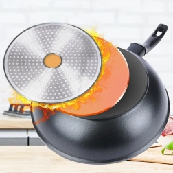 Wok GRANDE 30 cm kombinuje masivní hliníkové tělo pro rychlý a rovnoměrný rozvod tepla s odolnou nepřilnavou granitovou vrstvou, která usnadňuje vaření i čištění. Je ideální pro restování, smažení i dušení masa a zeleniny a skvěle se hodí pro pokrmy inspirované asijskou kuchyní, včetně rychlých nudlí a stir-fry.
