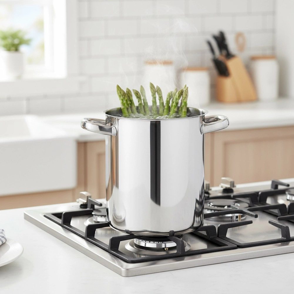 Praktický vysoký hrnec z kvalitní nerezové oceli 304 je navržen pro pohodlné vaření chřestu, špaget a dalších dlouhých potravin. Elegantní leštěný povrch zvenčí a matný vnitřek zajišťují profesionální vzhled a snadné čištění. Díky robustním nýtovaným rukojetím se s hrncem bezpečně manipuluje i při plném naplnění.