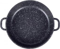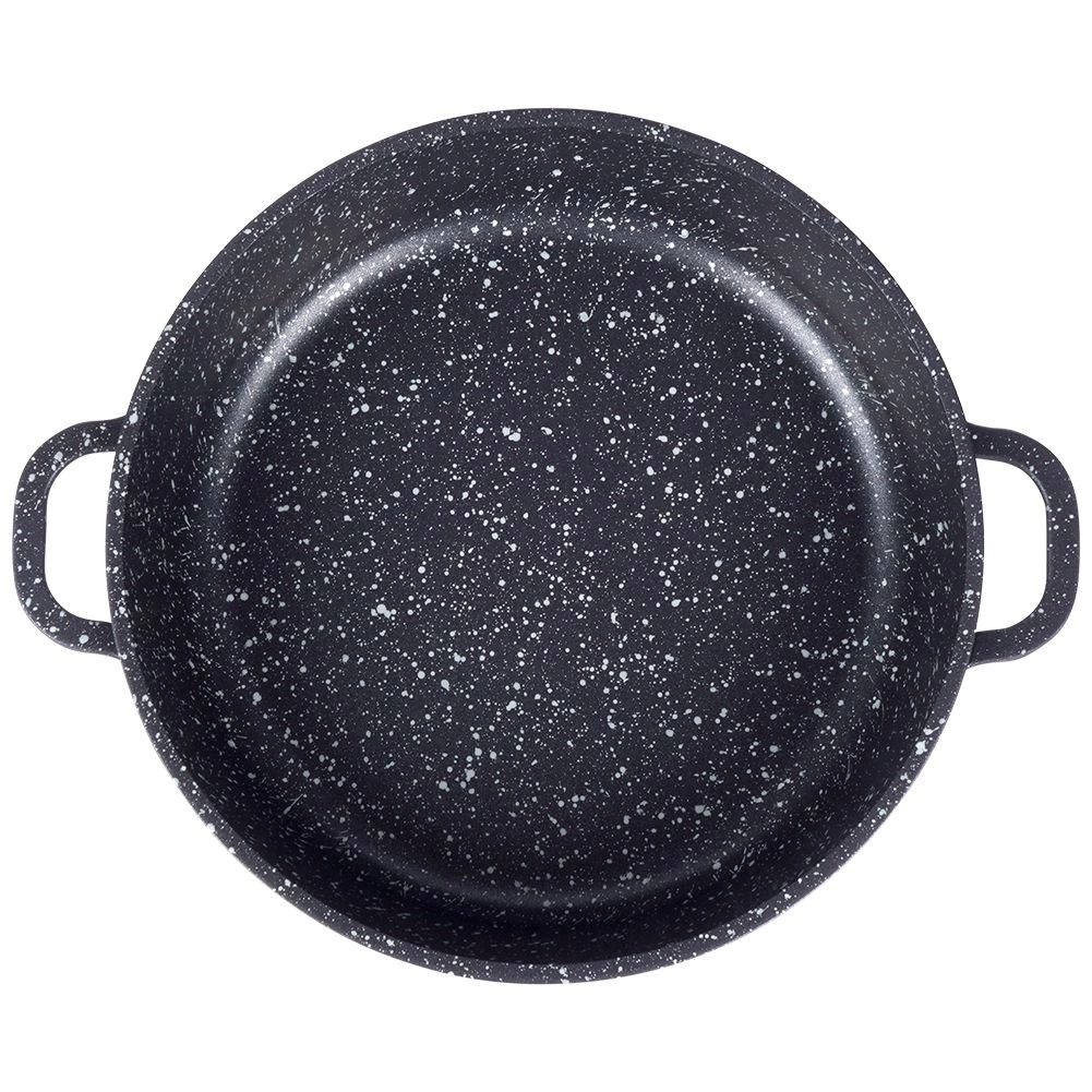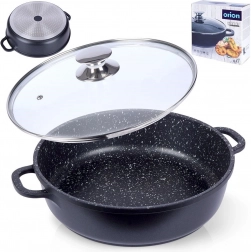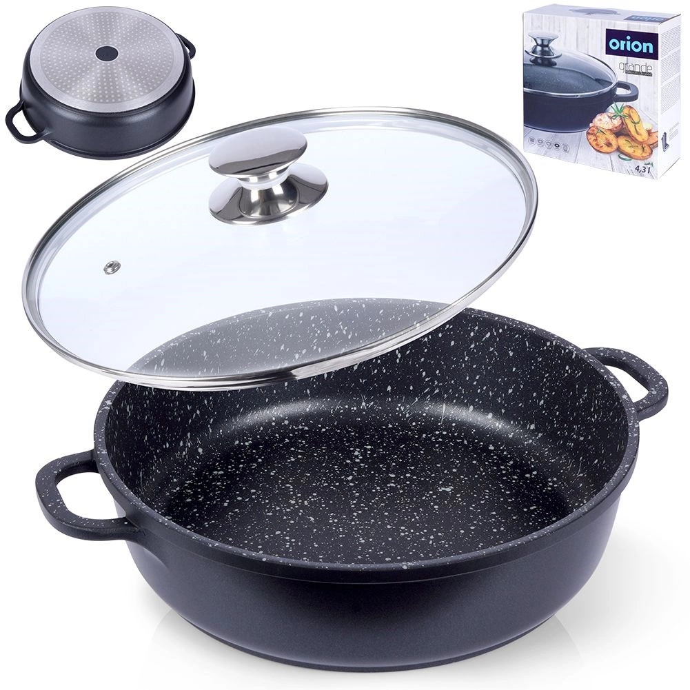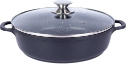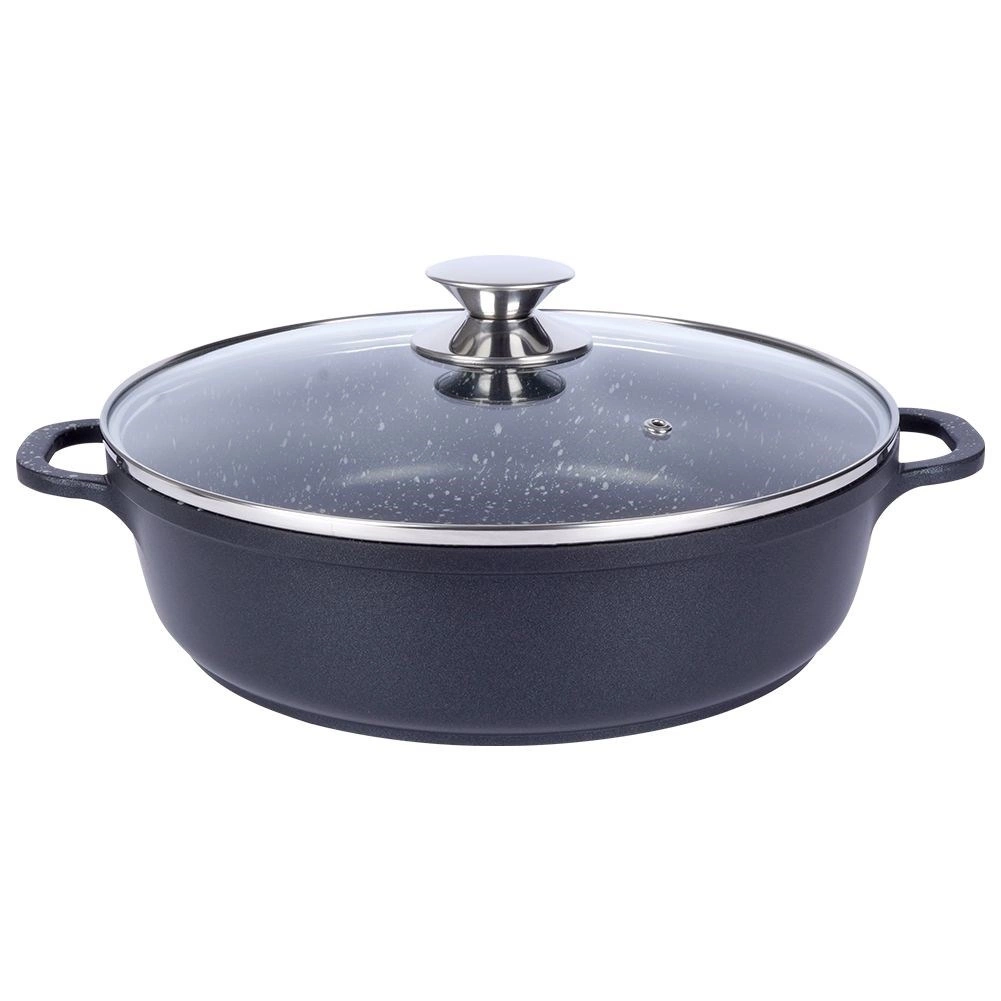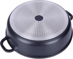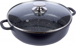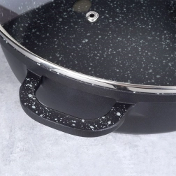 Robustní hliníková pánev v elegantním černém provedení s kameninovým vzhledem má uvnitř vysoce kvalitní granitový nepřilnavý povrch PFLUON, který odolá vysokým teplotám i poškrábání. Skleněná poklice s nerezovým lemem a paro‑ventilem usnadňuje kontrolu připravovaného jídla a udržuje vlhkost pro šťavnaté výsledky.
