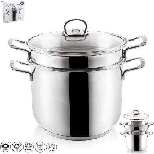 Součástí je skleněná poklice s ventilem pro bezpečný únik páry a ergonomický parní vložka s perforovaným dnem a pohodlnými uchyty. Vnější strana je leštěna do vysokého lesku pro elegantní vzhled i snadné čištění. Hrnec je kompatibilní se všemi typy sporáků včetně indukce a lze jej mýt v myčce.