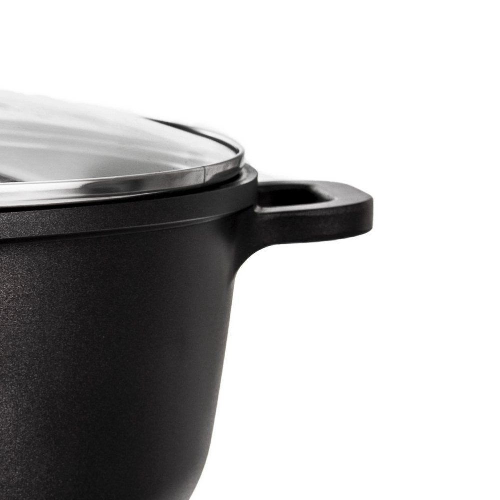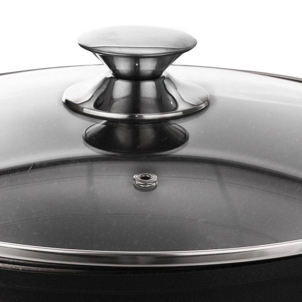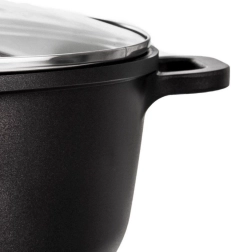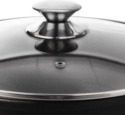 Tvrzené sklo s otvorem pro páru a robustní úchyty pro jistý úchop. Pánev má ergonomickou, neohřívající se rukojeť.