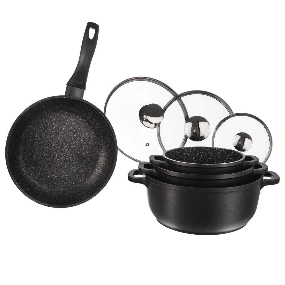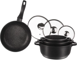 Sada GRANDE 7dílná je ideální volbou pro vaření, dušení i smažení. Tři velikosti hrnců s tvrzenými skleněnými poklicemi a všestranná pánev pokryjí většinu kuchyňských úkolů – od polévek a omáček až po maso, zeleninu či palačinky. Moderní granitová povrchová úprava PFLUON je odolná proti poškrábání, nepřilnavá a bez PFOA a PTFE, takže jídlo si zachová přirozenou chuť i živiny.