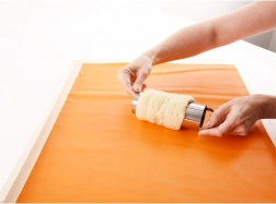 Nepřilnavá silikonová podložka poskytne stabilní plochu pro válení a tvarování těsta před navinutím na formu.