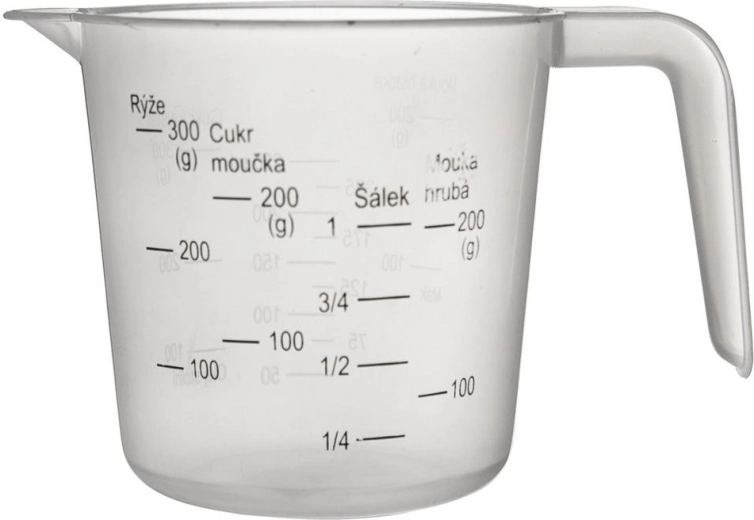 - Praktická a funkční – stupnice pro tekutiny (ml) i sypké suroviny (g) jako cukr, mouka, olej, mák či rýže.