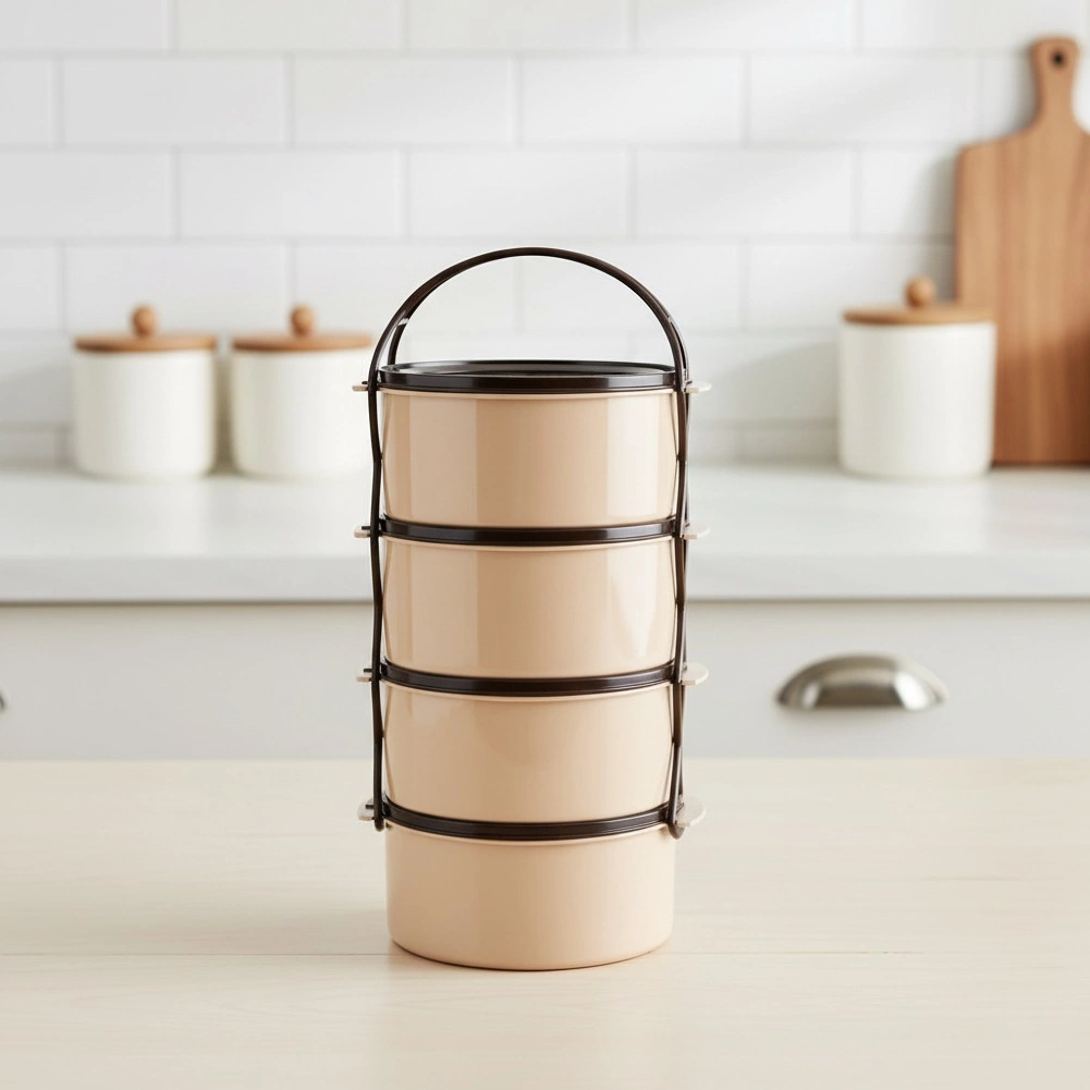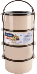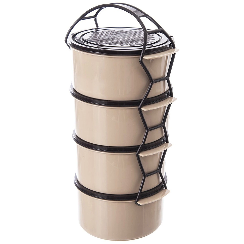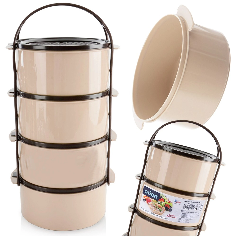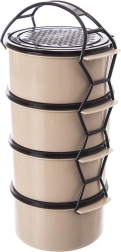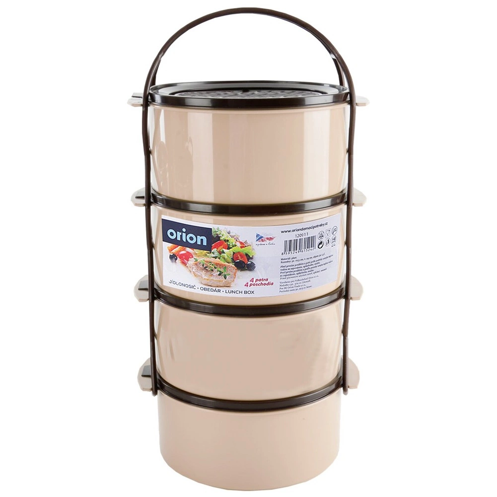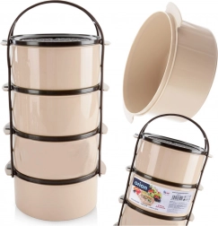 Praktická čtyřpatrová menážka na jídlo s objemem 4×1,5 l pro přehledné oddělení pokrmů. Má stohovatelné nádoby s víčky, pevný nosný rám s držadlem a odolné provedení v béžovo‑hnědé barvě. Vhodná do myčky, lednice, mrazáku a do mikrovlnky bez víka.