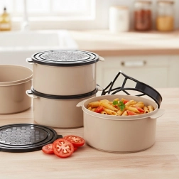Velkorysá kapacita pro hlavní chod, přílohy i dezert. Každá nádoba má vlastní víčko a uchovává jídlo odděleně a přehledně.