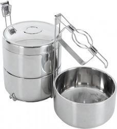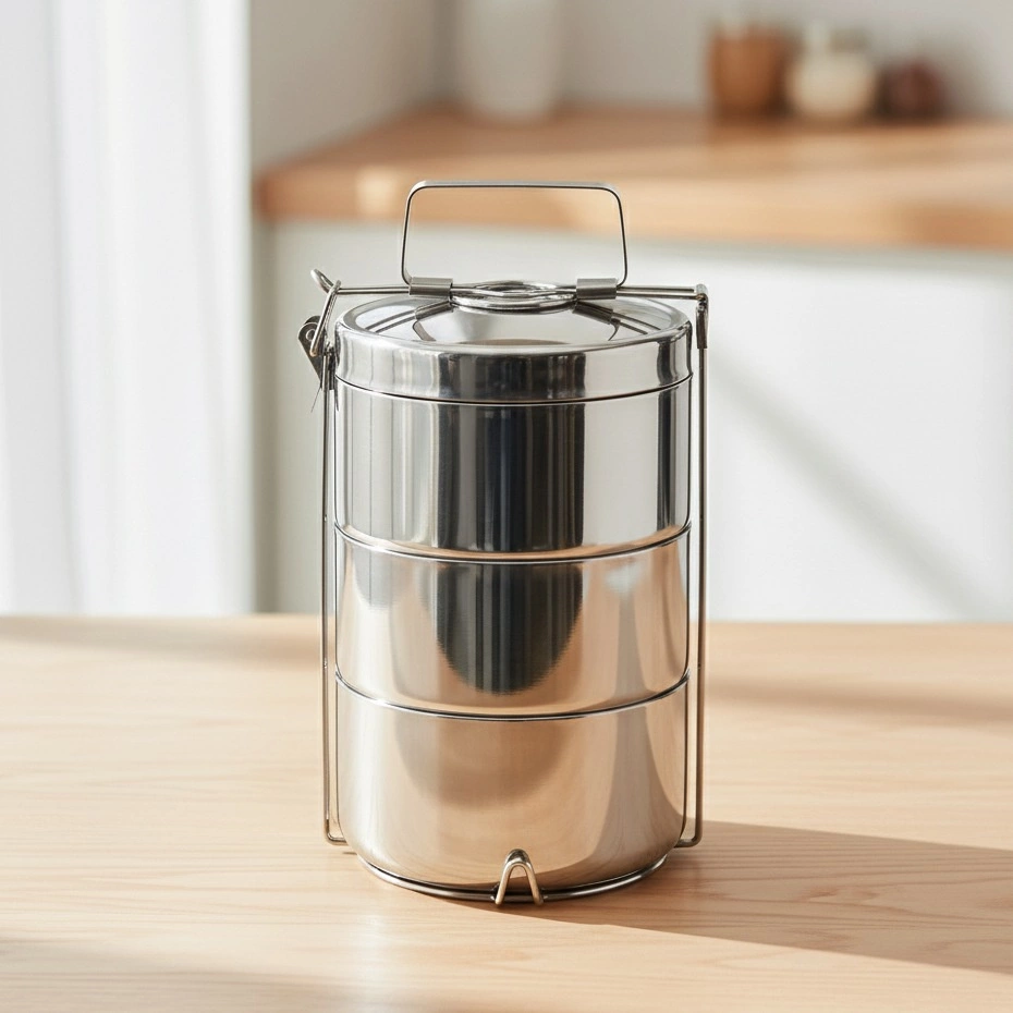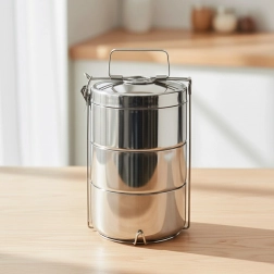 Pevná nerezová konstrukce, zajišťovací přezky a sklopné madlo udrží jídlonosič stabilní a pohodlný při přenosu i každodenním použití.